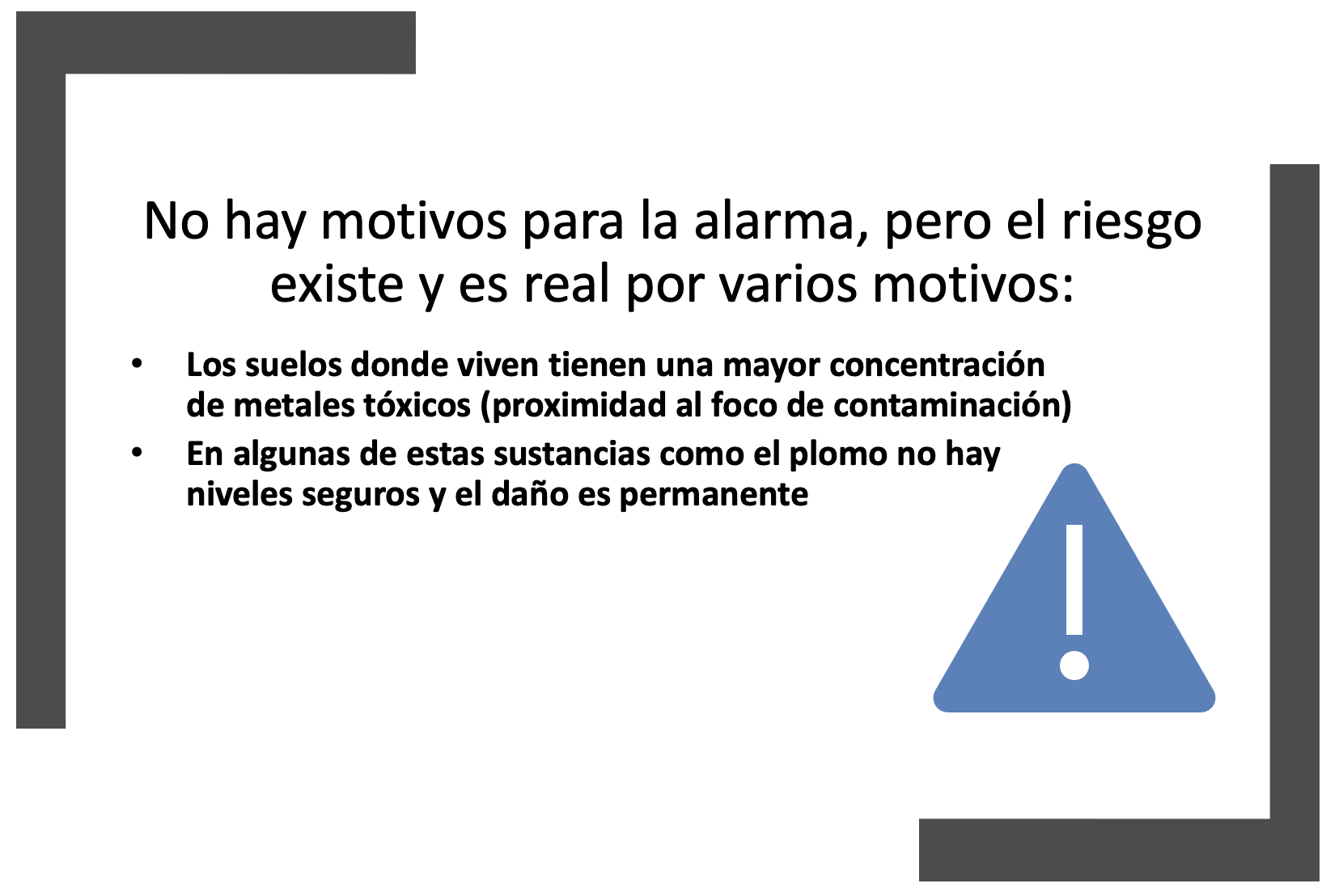 En las comunidades o pueblos con suelos contaminados puede haber altos niveles de plomo y otros tóxicos en el aire, en balsas de desechos de la minería o fundición y en el suelo en algunos lugares no residenciales. Las personas de estas comunidades podría haber estado en contacto con el plomo y el arsénico en el aire, el suelo. Además, las personas podrían entrar en contacto con el plomo a través del tabaco, de pintura vieja en las casas, cañerías o de otras fuentes en sus casas, y con el arsénico en su alimentación, pesticidas, agua,…Todos los niños/as, embarazadas, ancianos y enfermos crónicos de la Sierra Minera Cartagenera y Torreciega tienen el derecho a conocer sus niveles de plomo en sangre